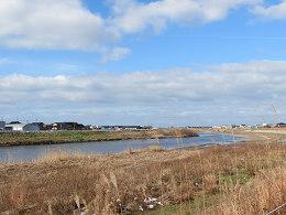 河口近くも工事だらけで、土手は広い範囲で土が剥き出しになっている。