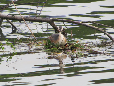 6月8日、川面を小枝をくわえていそいそと泳いでいくカンムリカイツブリがいた。
