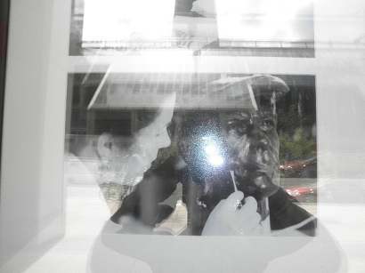 店のウィンドウガラスに映って....