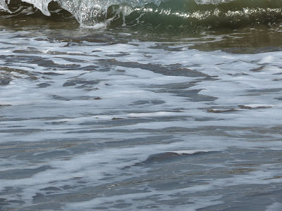海に続く林の中の小道、行く手に小鳥がポロっと道に下りたり、また梢に止まったりの