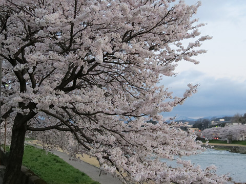 河岸の年老いた三本桜の周囲は、満開に咲き誇っていた。