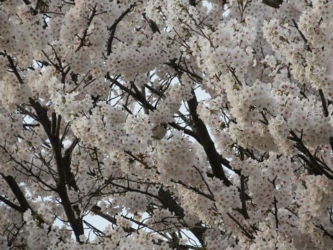 こんなに沢山つついて落としても、満開の桜の花が減っているようには見えない。