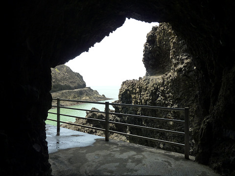 頭上に岩がせり出していたり、足元の岩の割れ目から遥か下方の海水が見えたりする。