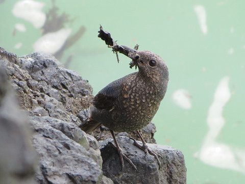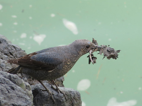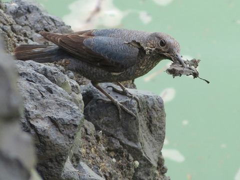 何かくわえたイソヒヨドリの♀が。 乾いた海草かしら。