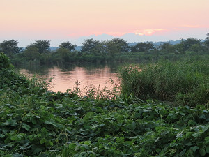 暮れなずむ水路脇の土手の上に、20人ほどが立ってリーダーの説明を聞いたり