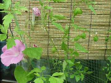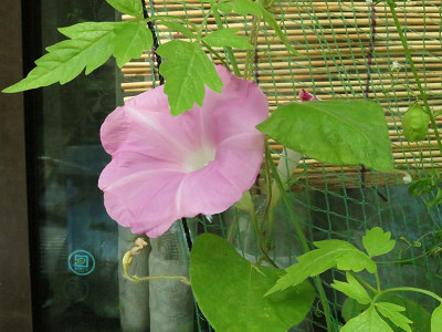 毎日ひとつづつ優しい薄紅の花を、グリーンカーテンの網の横からのぞかせている。