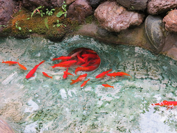 金魚たちは風に揺れる花々を眺めるのが大好きである。