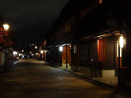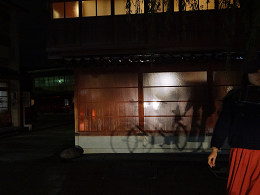 着物姿の人が、暗い街灯の下を