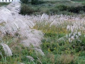 しばらく見なかった川原はすっかりススキの白い穂に覆われて、晩秋の野の色彩。