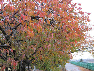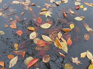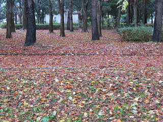 まだ緑の葉、紅葉真っ盛りの木々、小径に散り敷く落ち葉の豊かな色彩が、
