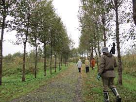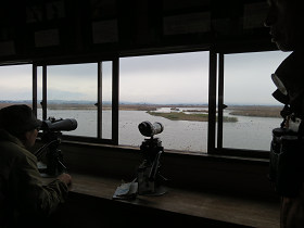レンジャーの案内で、潟の周辺の田んぼで採餌するオオヒシクイを遠くから観察。