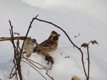 ミヤマホオジロも2羽、せわしなく移動しながら雪の上で何かを食べていた。