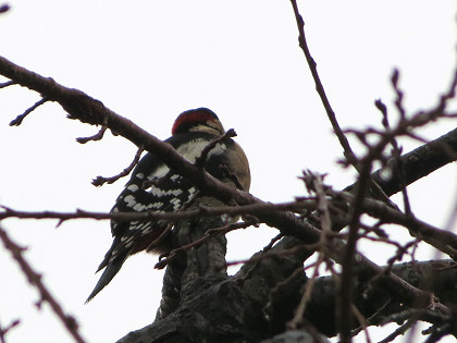 誰かがアカゲラの声がすると言い、探すと木の間で遠慮がちに鳴いていた。