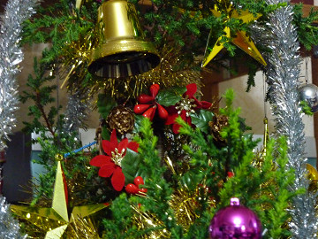大きなツリーが置かれていて、濃い緑の樅の枝に無数に飾られている金と赤の飾り。