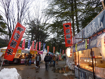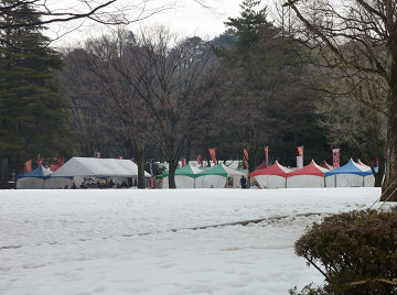 雪原に各地の名産の食べ物を売る