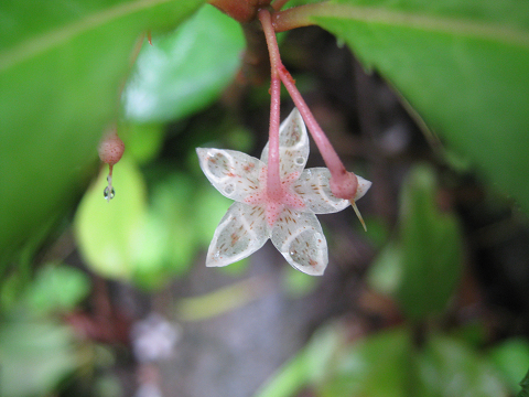 雨で透きとおったヤブコウジの花
