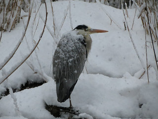 背に雪が積もったアオサギ。