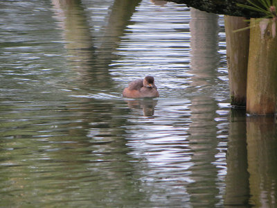 工事区間が途切れた所で、カルガモの群に混じってしきりに水に潜る水鳥が、