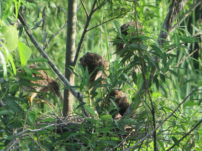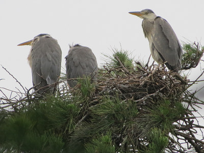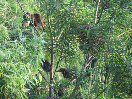 1本の木にゴイサギの巣が幾つもあって、幼鳥たちが巣の近くの枝にとまっている様子は