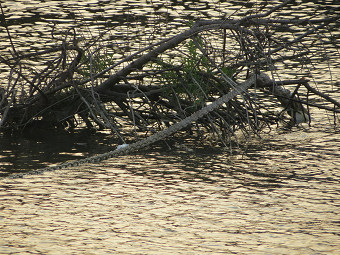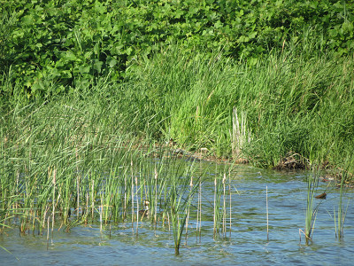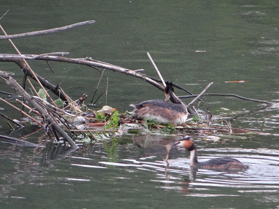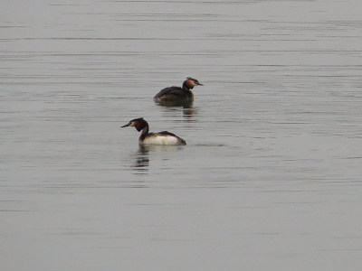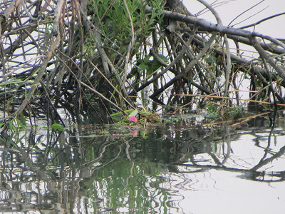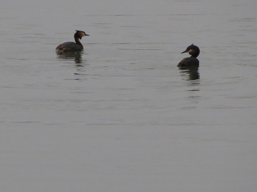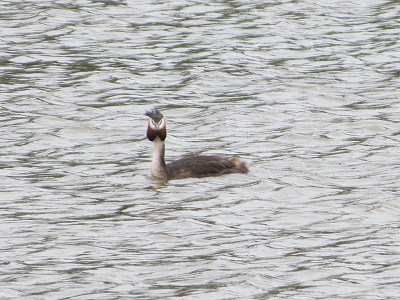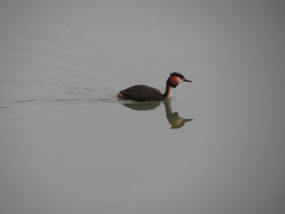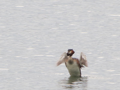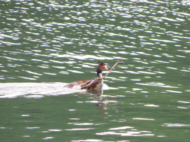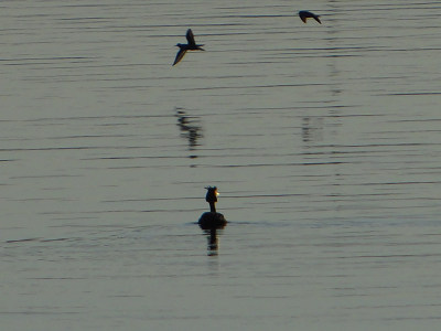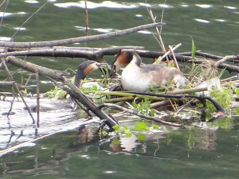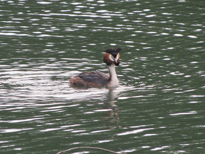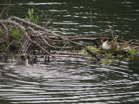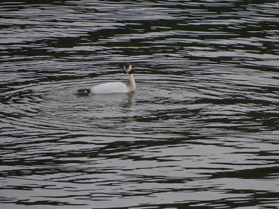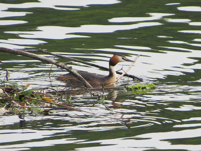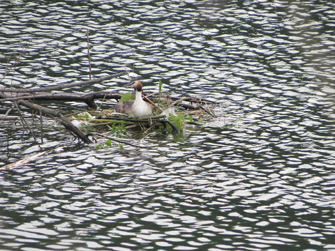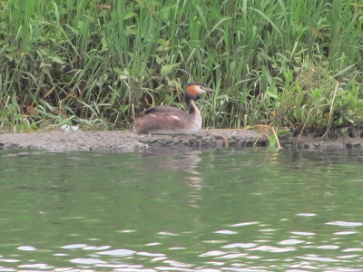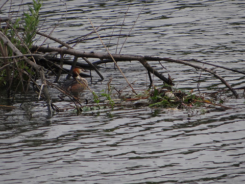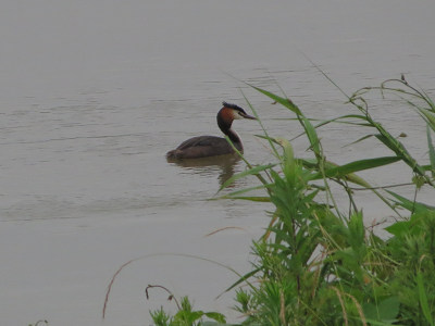 撮った写真を後で見ると、ヨシの間にカンムリカイツブリが隠れていた。
