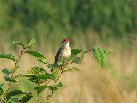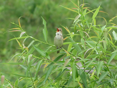 葉陰で大きな口を開ける子供たちに食事させているコサギ一家。