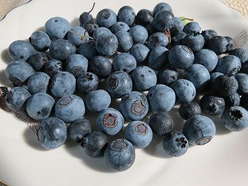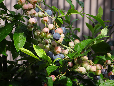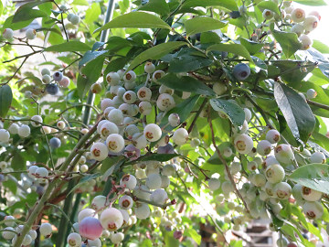ブルーベリーの白っぽい実が端から黒くなって、熟したものは簡単に枝から離れる。