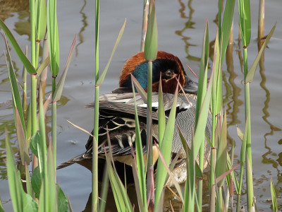 ヨシに潜り込んでいて、あまり上の方まで登って来ていない。