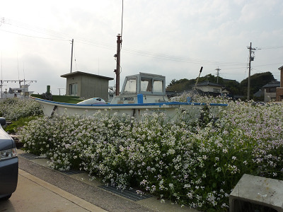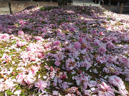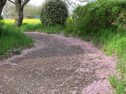 散り敷く桜の花びらと、菜の花畑の黄色が、素敵な風景を作り出していた。