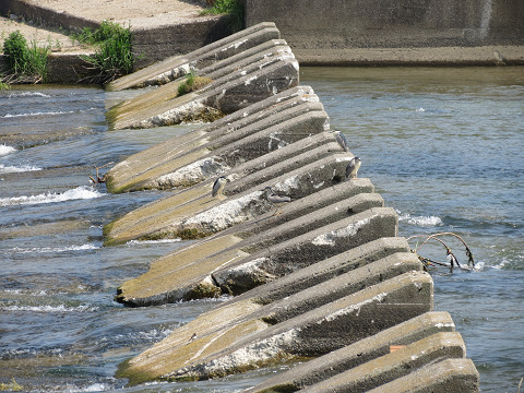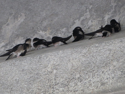 橋脚の出っ張りに並んでいるツバメたち。
