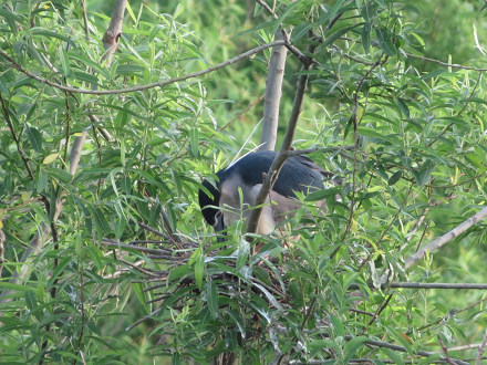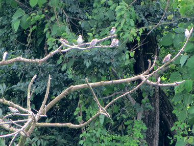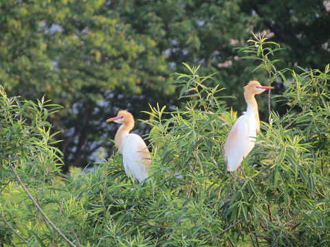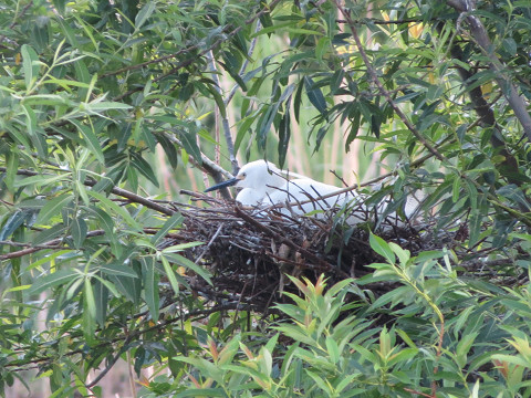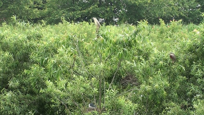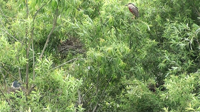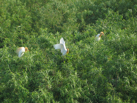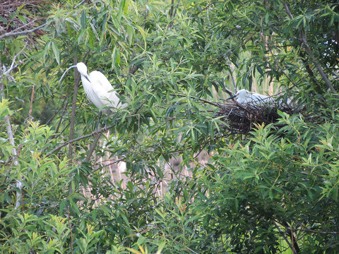 大勢のサギたちがとまっている木の繁った葉影に、巣ごもりしている姿も垣間見える。