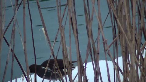 草の間を通って水に滑り込む姿が。コガモかしら。