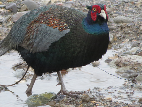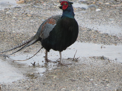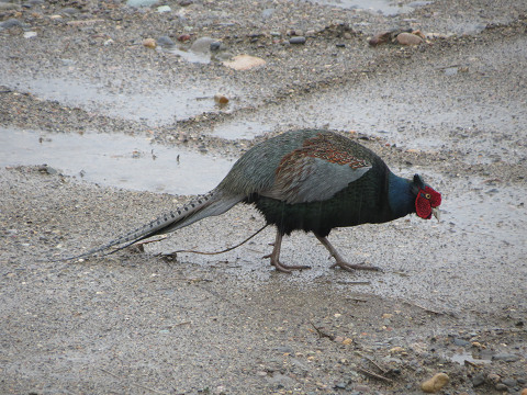 工事現場の土の上に綺麗なキジの♂が現れた。