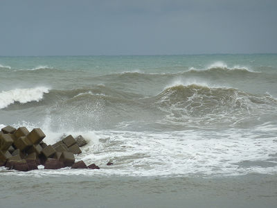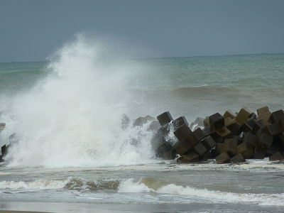 高い波頭が防波堤に砕けて白いしぶきが上がっていた。