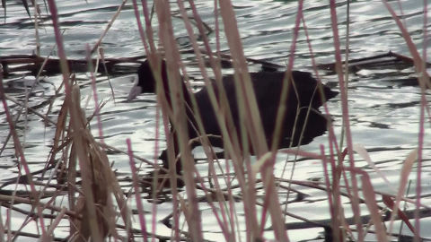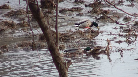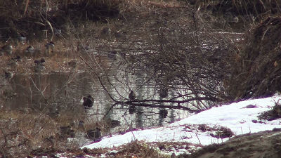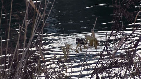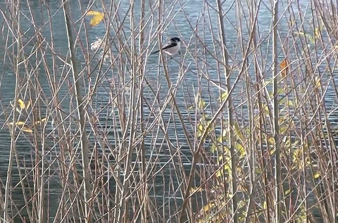 木々の間から川にいるオオバンやカモたちを見ていたら、
