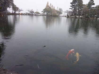 霞が池のコイたちに会いに行くと、みんなどことなくぼんやりしている。