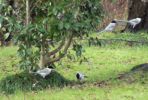木の下の方で、土や木の皮をほじくっているオナガたち。