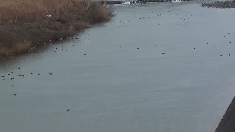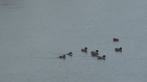 児童公園の入口でMさんと別れ上菊橋を渡ると、雨の中、無数のコガモたちが