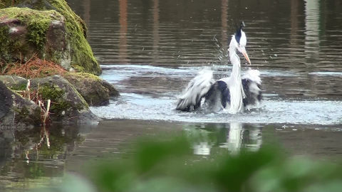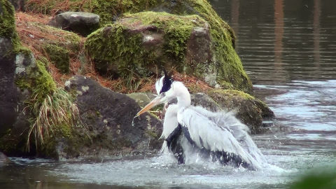 追記:後で調べたら、アオサギが水浴びする時、独特の脂粉をまき散らす