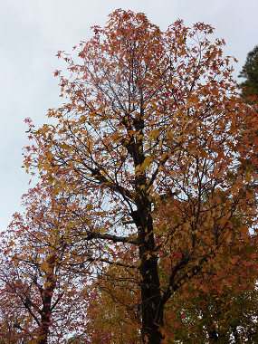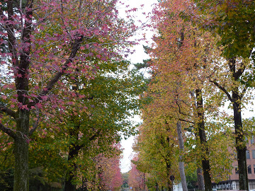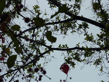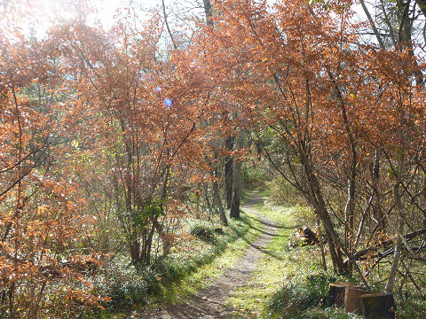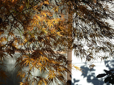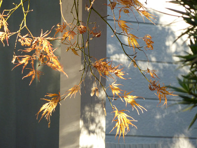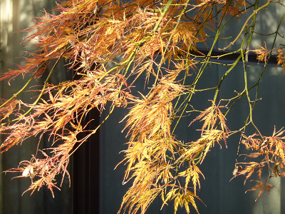 折しも陽が射し始め、名残の紅葉が輝いた。