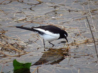 田植え前の水が張られた田んぼで、何か小さい鳥が小刻みに動いていた。